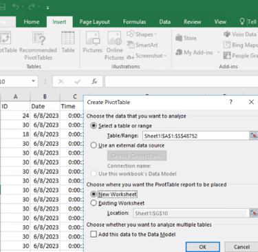 Once the data is copied in excel, click anywhere in the sheet, then Goto insert tab --> click Pivot --> select new worksheet